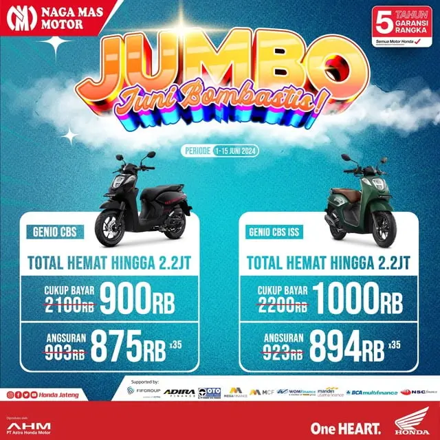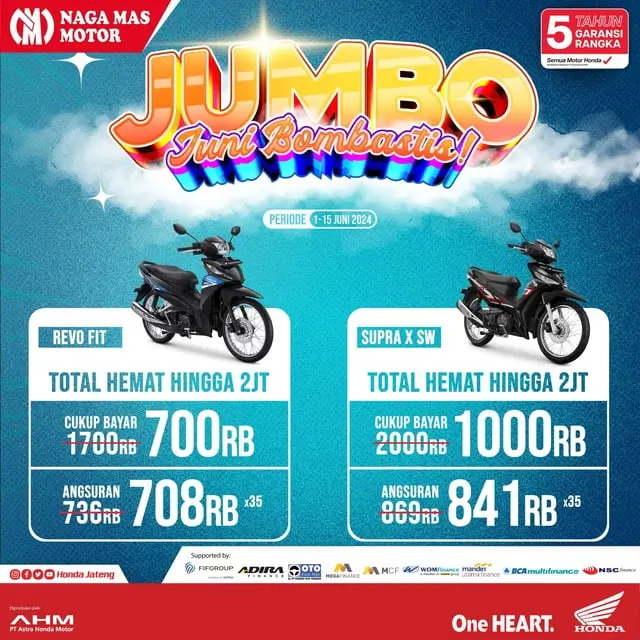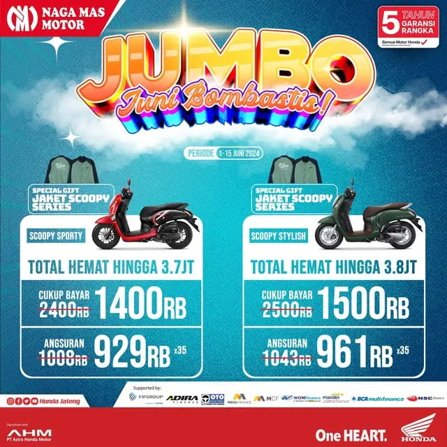Selamat datang di dealer motor honda Solo. Pada kesempatan kali ini saya mau informasikan ada banyak sekali promo pada bulan ini Juni 2024. Namanya Promo Jumbo yaitu Juni Bombastis.